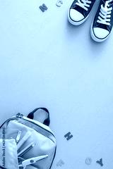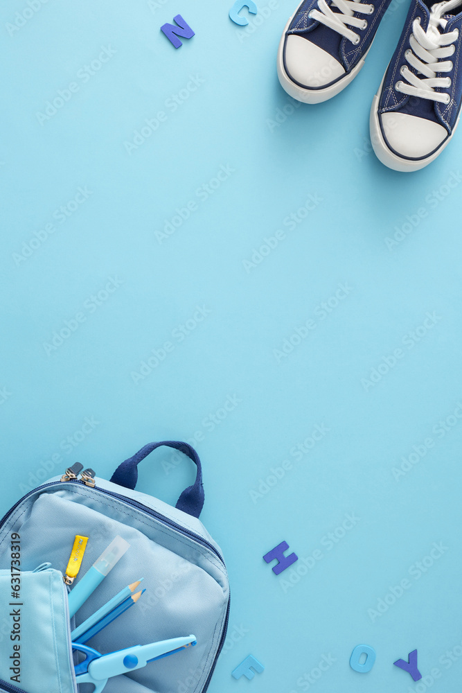 Education for young minds concept. Top view vertical shot of trendy sneakers, rucksack, pencil box, pencils, scissors, marker, blue letters on pastel blue background with empty space for promo or text