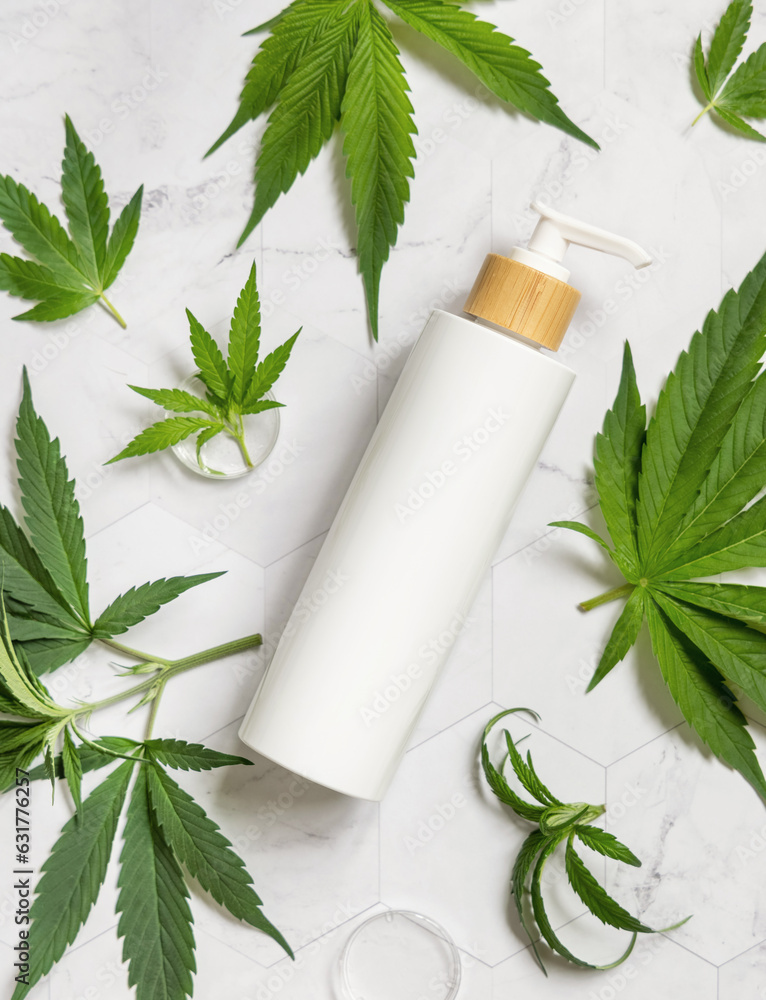 White One pump bottle near green cannabis leaves on marble top view. Cosmetic Mockup