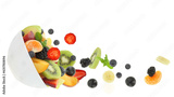 Fresh mixed fruits falling into a bowl isolated on white transparent background, PNG