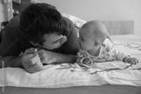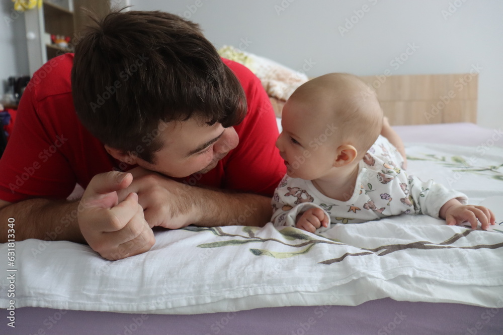 father holding a baby girl up to six months in his arms smiling funny
