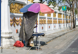 Selling religious souvenirs and items in front of the entrance to the Buddhist monastery, Bangkok, Thailand