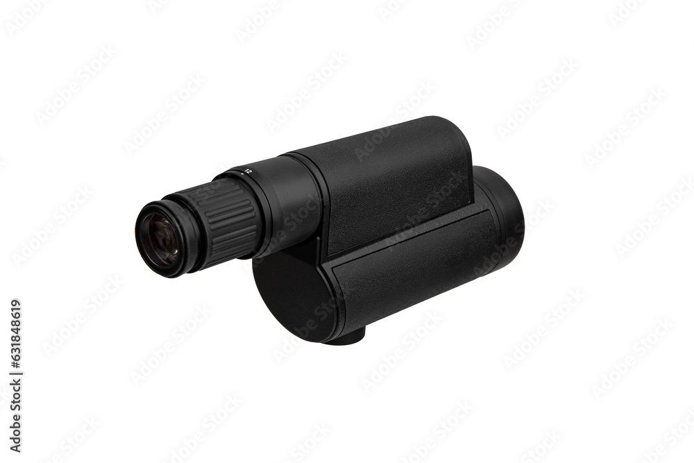 Modern spyglass. Long-range observation device. Monocular isolate on a white back