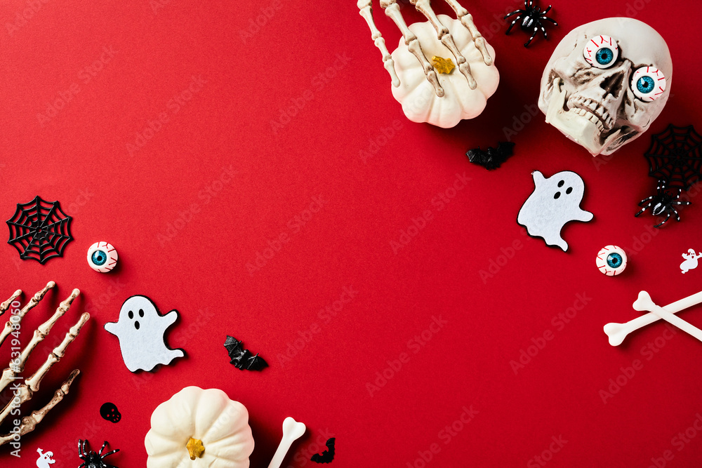 Halloween greeting card, party invitation design. Flat lay Skull with bloody eyes, white pumpkins, bones, spiders, webs, ghosts on red background. Happy Halloween holiday concept.