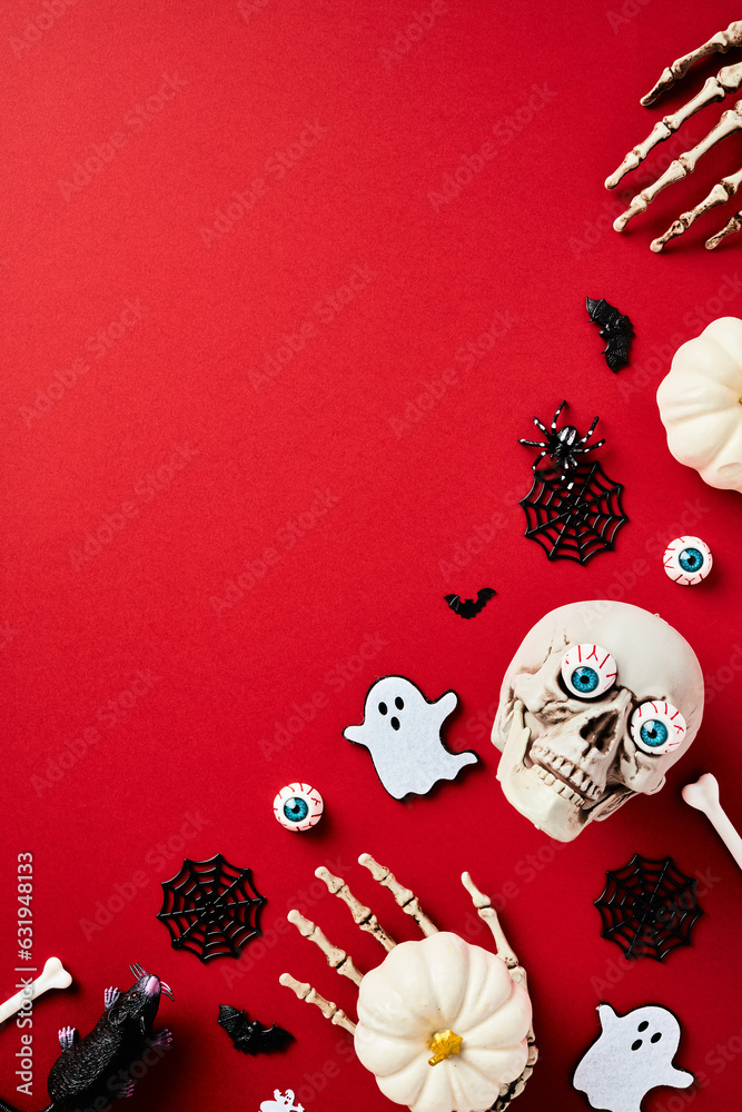 Happy Halloween vertical banner design. Halloween flat lay composition with skull, bones, skeleton hands, pumpkins, ghosts, spiders, bats on red background.