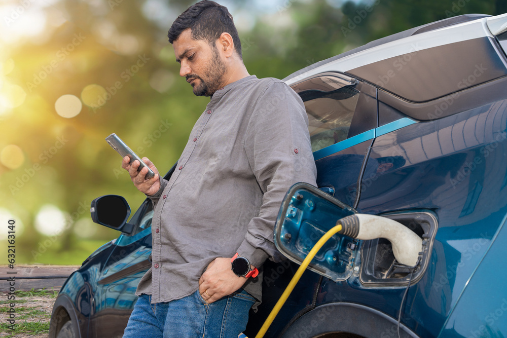 Indian man using smartphone while his modern electric car getting charge at charging station. Electric vehicle Recharging battery charging port. Renewable energy or green energy.
