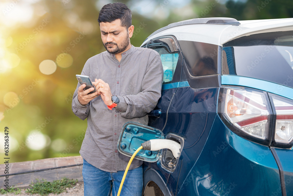Indian man using smartphone while his modern electric car getting charge at charging station. Electric vehicle Recharging battery charging port. Renewable energy or green energy.