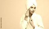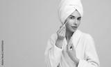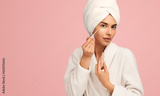 Young woman using concealer brush after shower