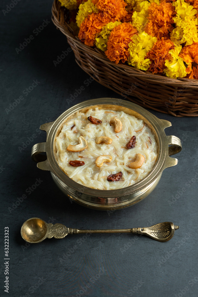 Onam special semiya payasam in a brass uruli with flowers on the background
