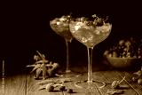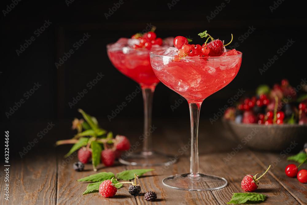 Glass of berry cocktail with fresh berries on wooden background