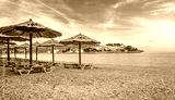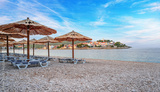 Straw umbrellas with sunbeds on the beach. Straw umbrellas and stacked deck chairs on the beach at sunset or sunrise. Primosten, Croatia.