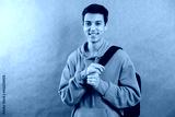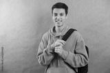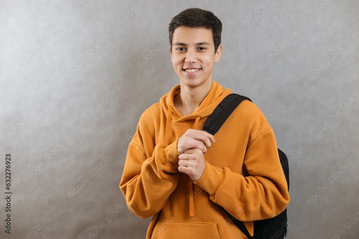 Portrait of a young student with a school bag. The teenager smiles and looks at the camera.