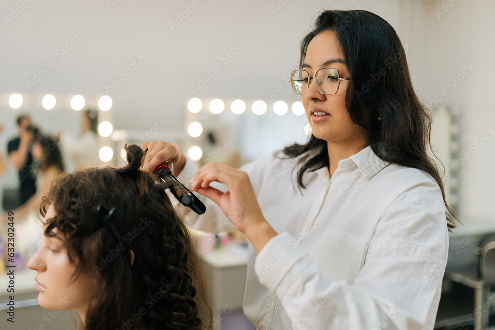Side view of hairstylist making waves curling on woman hair. Closeup of female hairstylist in beauty salon takes lock of hair and presses with hair straightener. Concept of fashion and beauty.