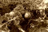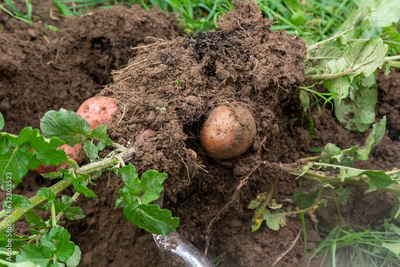 Harvest of fresh, red, organic potatoes on the ground of country field