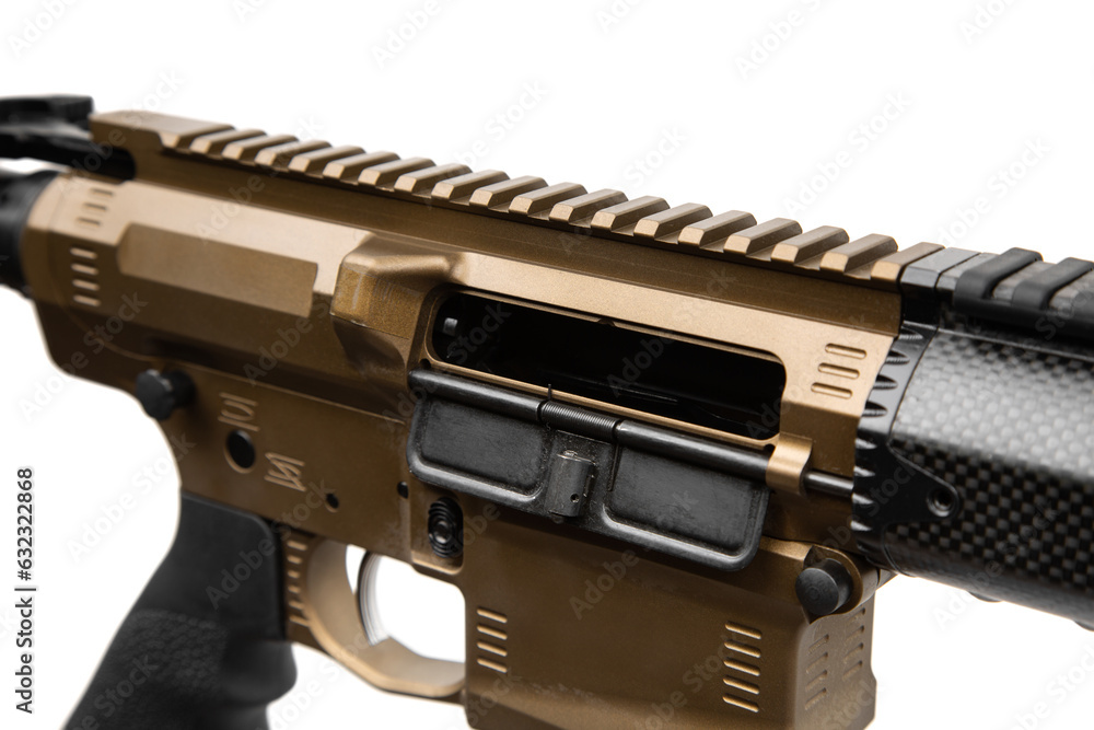 Modern automatic rifle isolated on white background. A gold-coloured weapon with a carbon forearm and barrel. Assault rifle on white back. Automatic carbine.