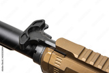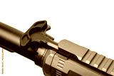 Modern automatic rifle isolated on white background. A gold-coloured weapon with a carbon forearm and barrel. Assault rifle on white back. Automatic carbine.