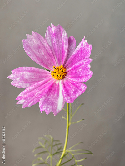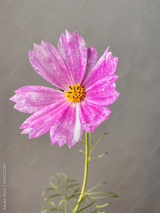 Beautiful pink flower close up on moody rustic background. Stylish artistic composition of cosmos. Floral vertical wallpaper. Flowers Still life.