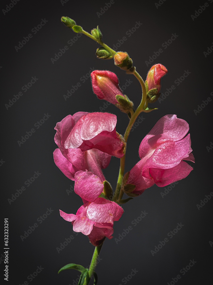 Flowers Still life. Beautiful pink snapdragon close up on moody grey background. Stylish artistic composition. Floral vertical wallpaper
