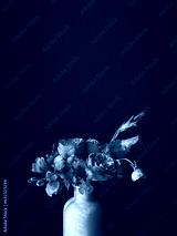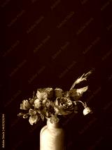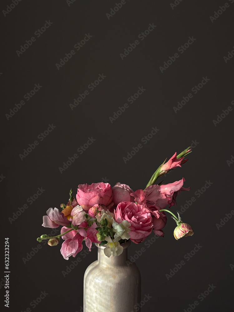 Flowers Still life. Beautiful pink flowers in vase in light on moody grey background. Stylish artistic composition of snapdragon, roses, ranunculus,gladiolus. Floral vertical wallpaper