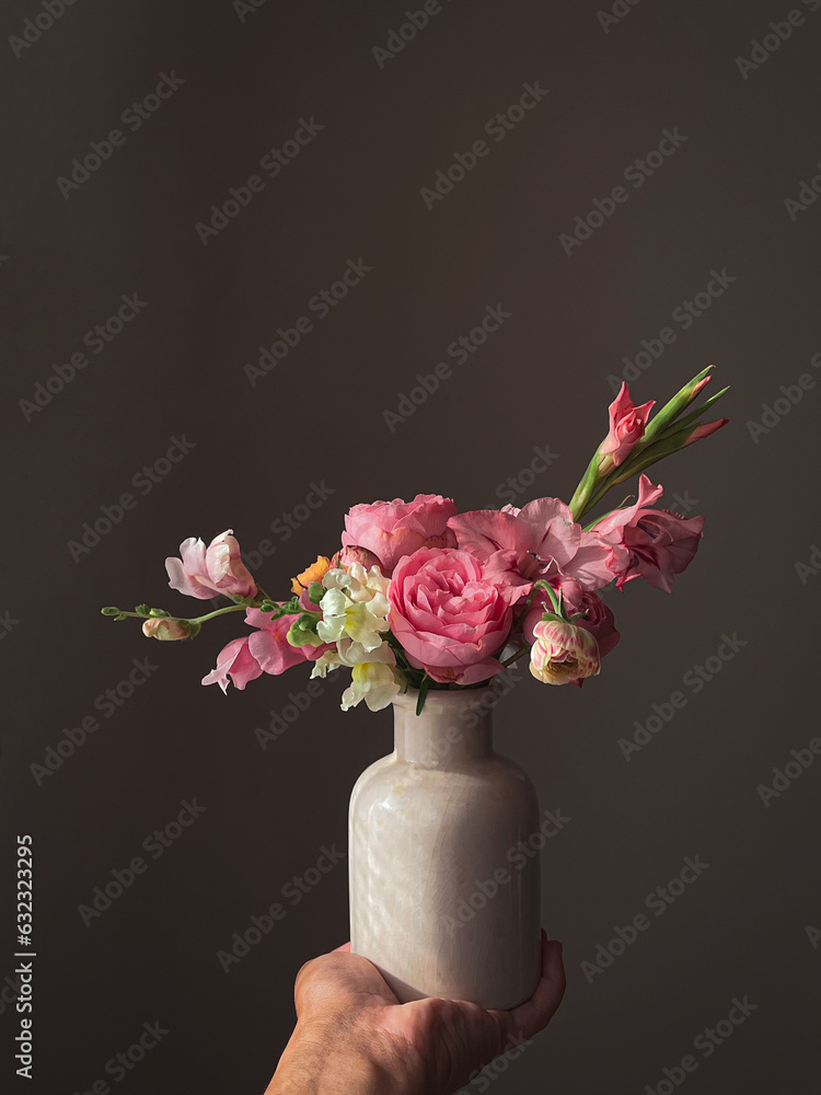 Hand holding beautiful pink flowers in vase in light on grey background. Stylish composition of snapdragon, roses, ranunculus,gladiolus. Flowers Still life. Floral vertical wallpaper