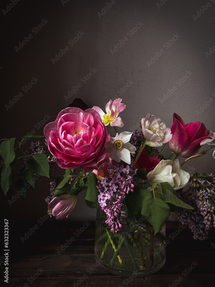 Beautiful tulips bouquet in vase in sunlight on moody background. Stylish spring flowers still life, artistic composition. Floral vertical wallpaper