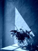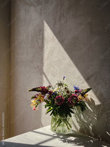 Beautiful lupine bouquet in vase in sunlight on rustic background. Stylish spring flowers still life, artistic composition. Floral vertical wallpaper