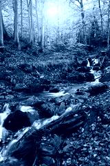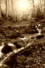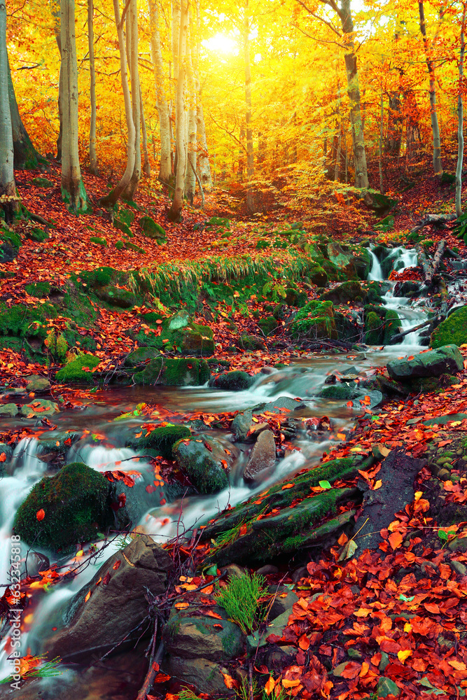 perfect autumn landscape, unbelievable morning in the forest, fast stream between beech trees and gold leaves
