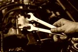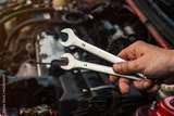 wrenches in the wizard's hand close-up against the background of the car being repaired