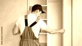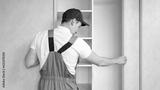 Repairman in uniform inspects broken closet in light bedroom. Male worker finds problem of defective closet door. Home furniture repair service, close-up