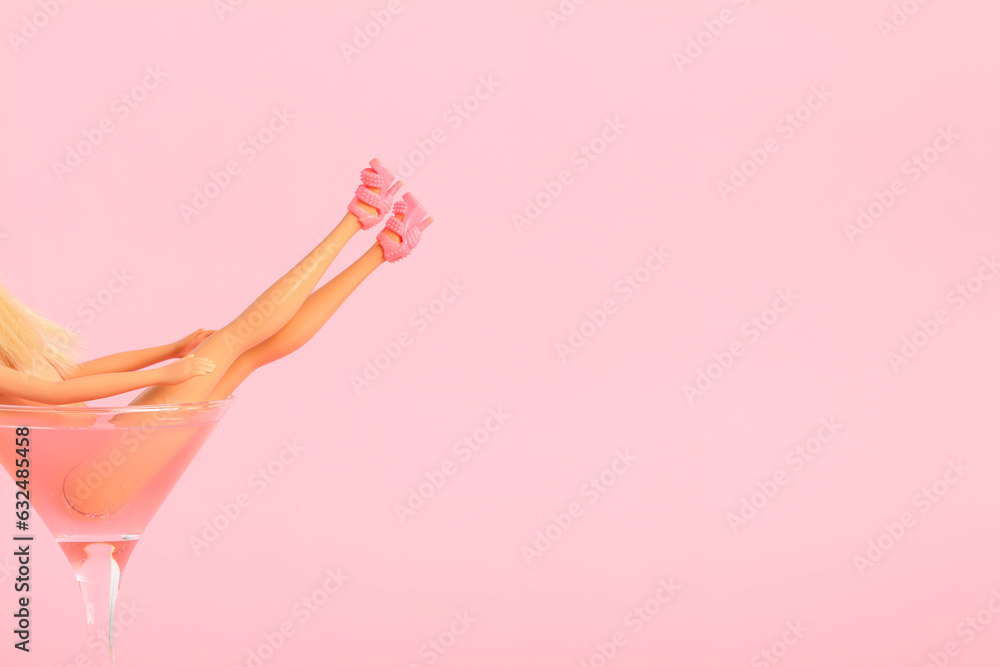 Doll legs sticking out of martini glass with cocktail on pink background. Party invitation card design.