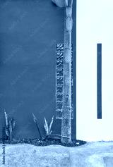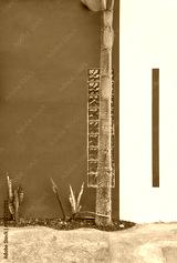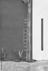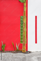 Street view of red and white building facade with cactus, architecture background, Ecuador.