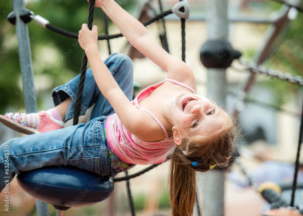 Funny smiling little girl playing at the playground and climb the ropes outdoor