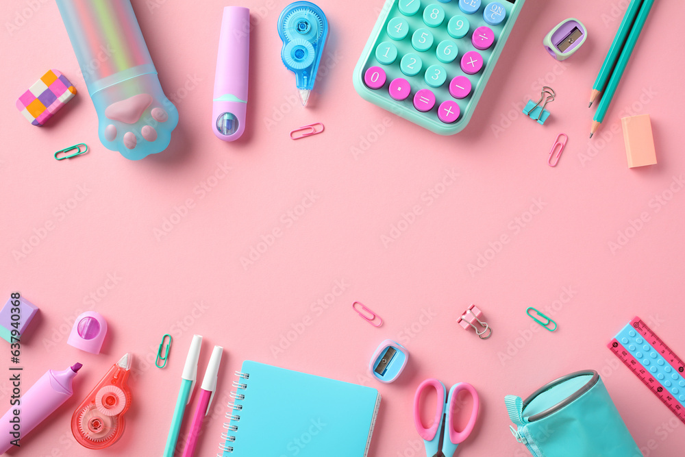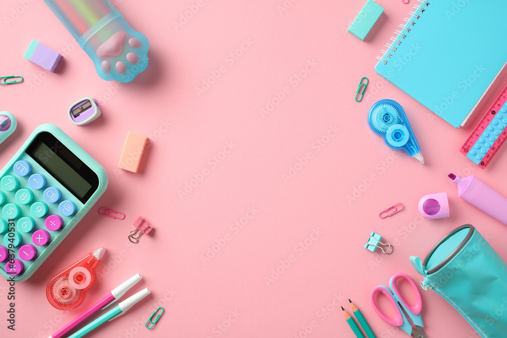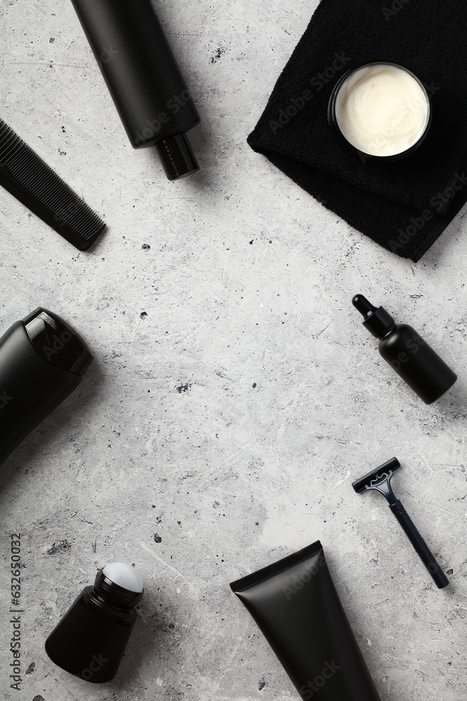 Men beauty and health care concept. Black cosmetic bottles, shaving razor, moisturizer cream, shampoo, shower gel, towel on stone table. Top view. Flat lay.
