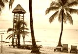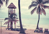 Retro toned picture of an empty tropical beach with lifeguard tower, Yucatan Peninsula, Mexico.
