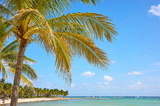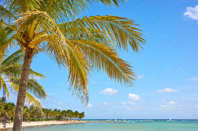 Coconut palm trees at a tropical beach, Yucatan Peninsula, Mexico.
