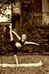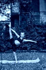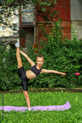 Rhythmic gymnastics. Preteen child exercising with gymnastic mace outdoor. Healthcare concept