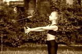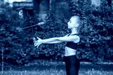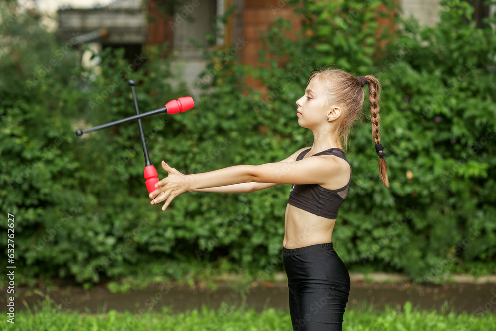 Rhythmic gymnastics. Preteen child exercising with gymnastic mace outdoor. Healthcare concept