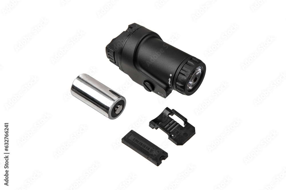 Modern LED flashlight with weapon mount. Underbarrel tactical flashlight isolate on white back.