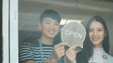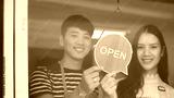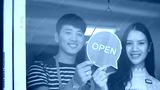 Happy Coffee Shop owner in an apron turning open sign board on glass door. Small business owner opening a small business.