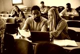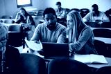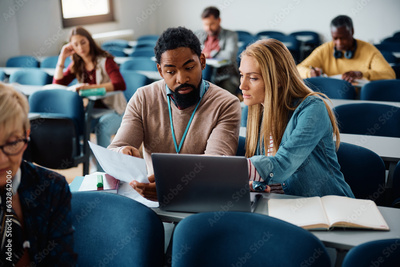 Black adult education teacher assists his student with an assignment during class in classroom.