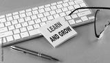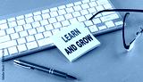 LEARN AND GROW text on a sticky with keyboard, pen glasses on grey background