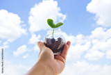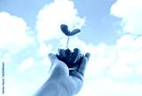 新芽を青空に掲げる女性の手