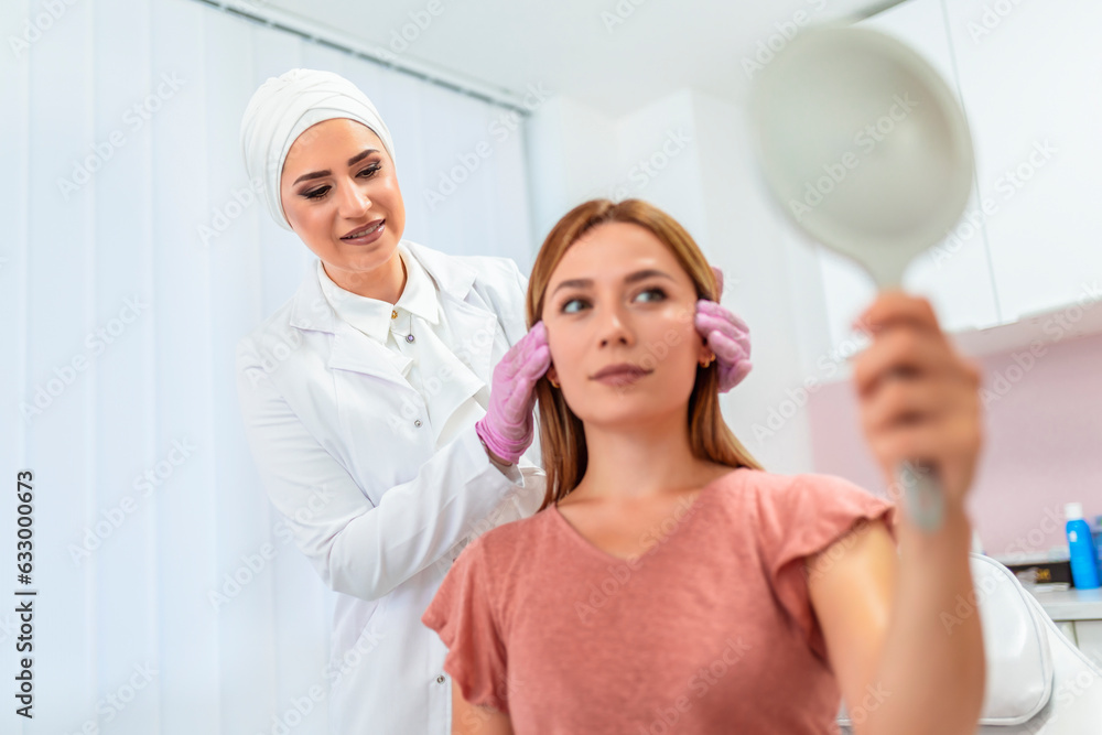 A doctor examines the patient before the aesthetic procedures. The patient looks at herself and tells her what she wants to change.