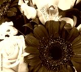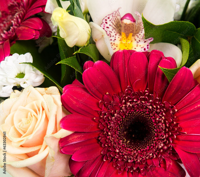 Bouquet of fresh gerbera, rose and orchid flowers close-up