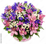 Bouquet of orchid and iris flowers in basket isolated on white background