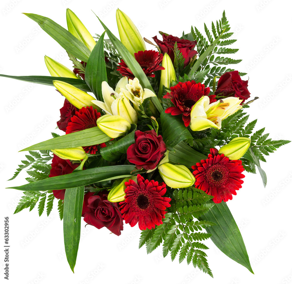 Bouquet of red rose and gerbera flowers isolated on white background, top view