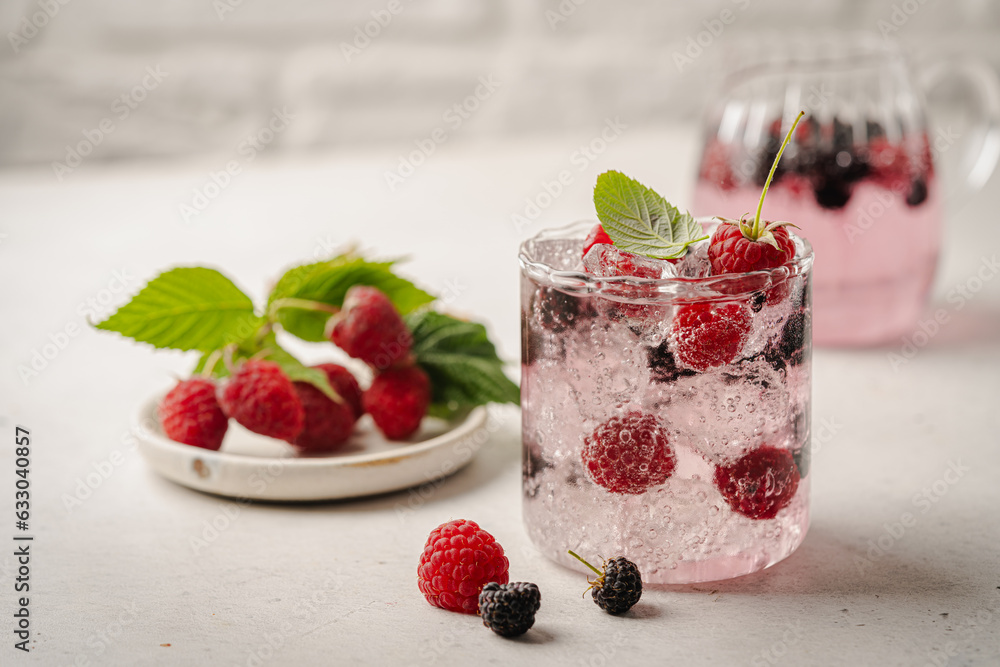 Glass of berry cocktail or drink soda with fresh berries on white background