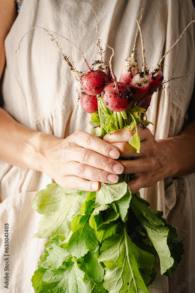 Farmers holding fresh radish in hands on farm. Woman hands holding freshly bunch harvest. Healthy organic food, vegetables, agriculture, close up