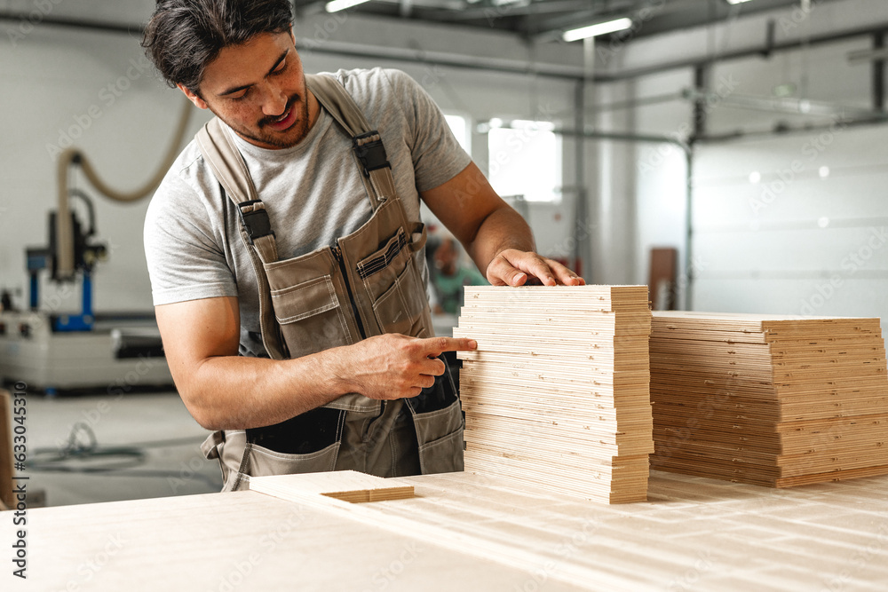 Young carpenter man looking and choosing wood plank at workshop in carpenter wood factory