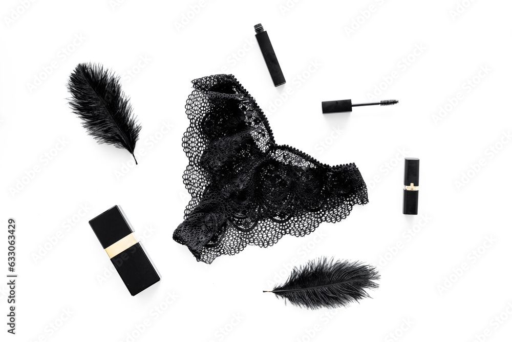 Lace elegant womens lingerie bikini panties with accessories, top view