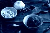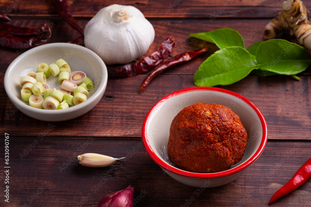 Thai red curry paste in white bowl,is a versatile and flavorful base for a variety of Thai dishes,with copy space